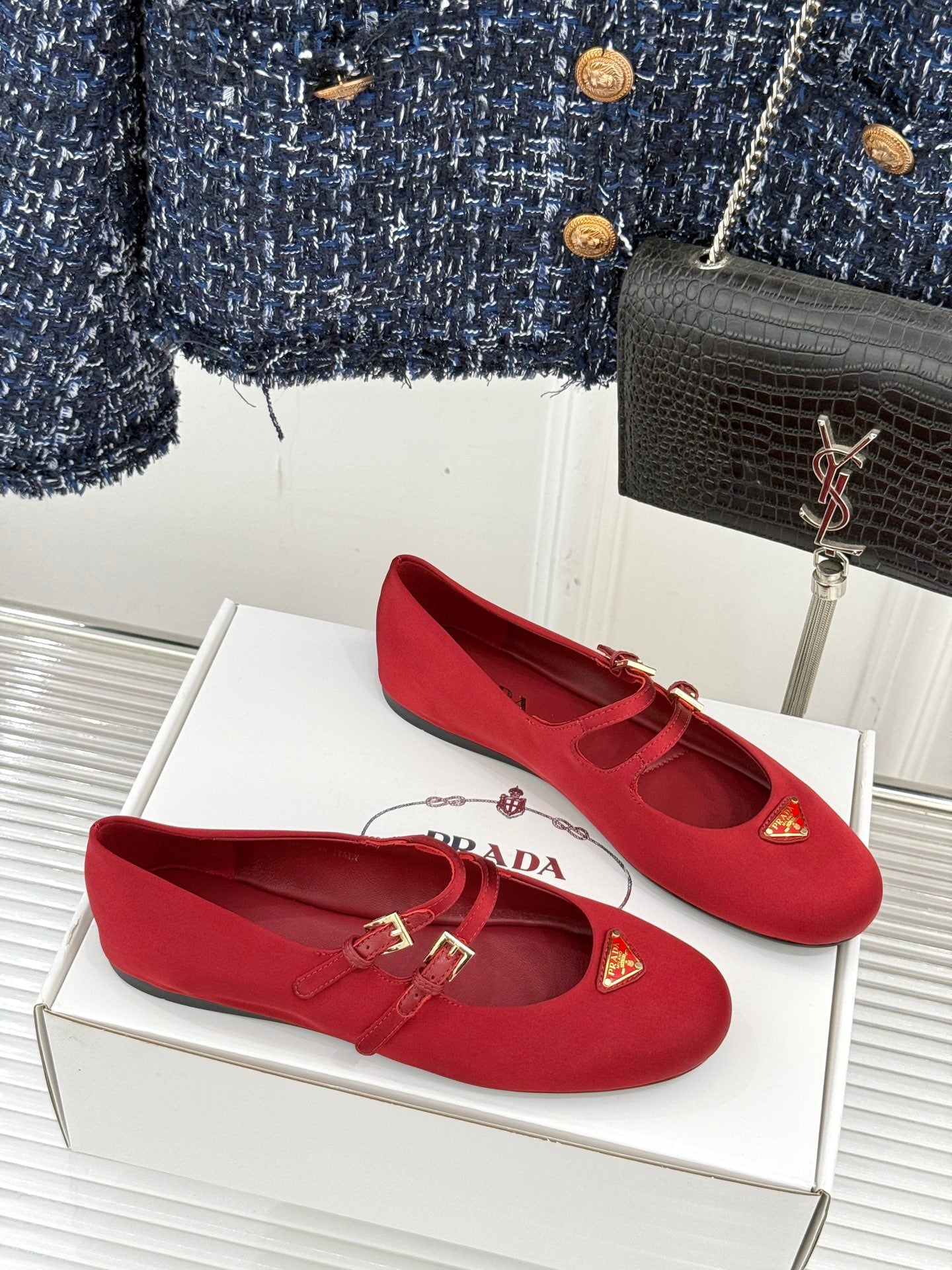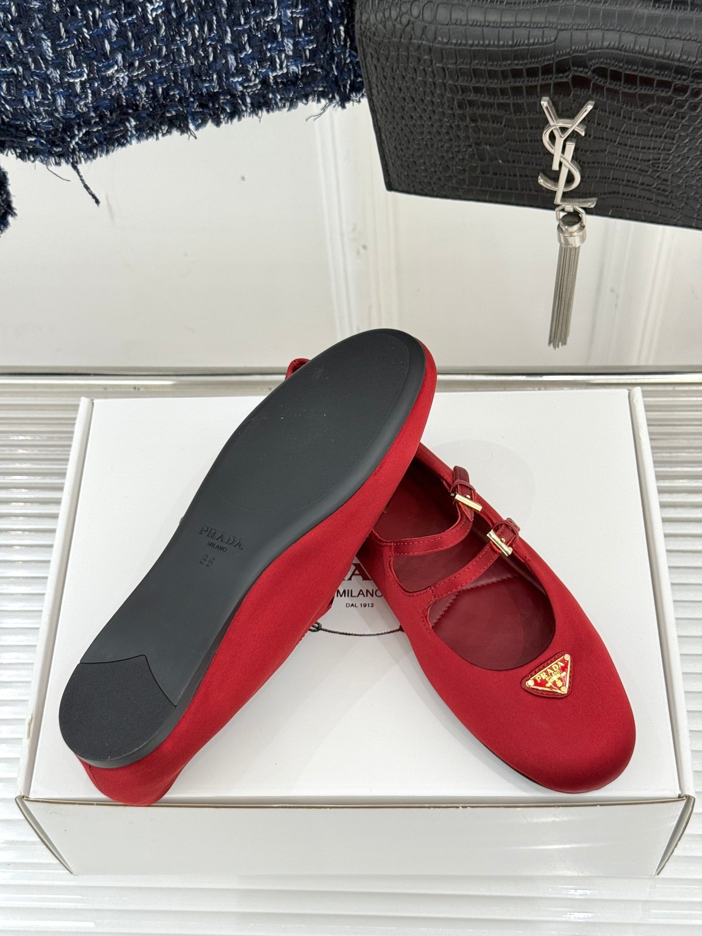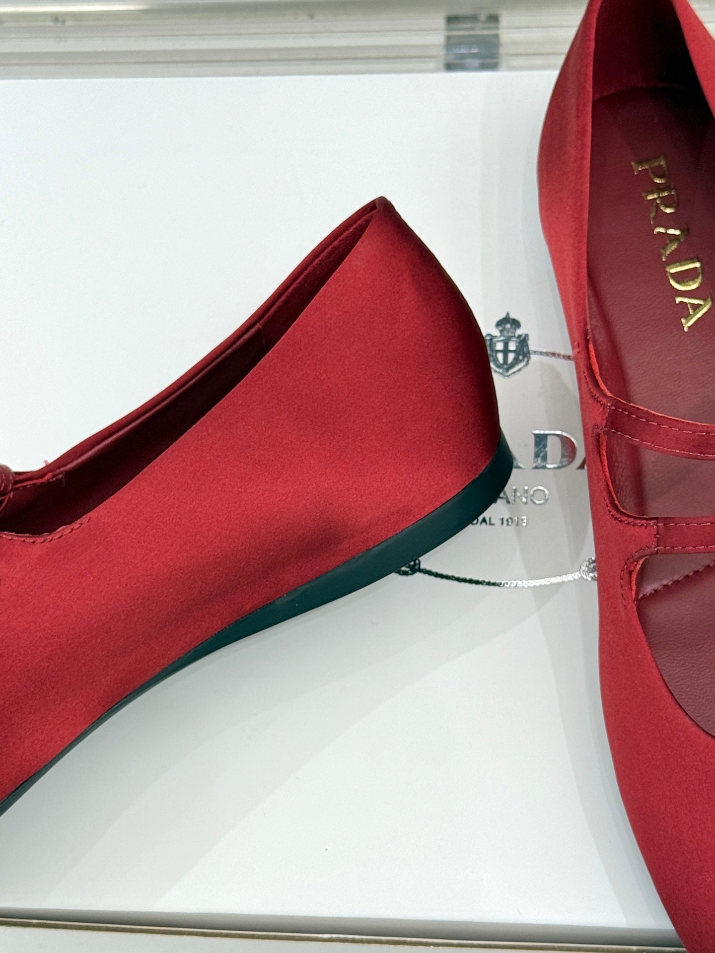 PRADA 25S DOUBLE STRAP BALLERINAS IN RED WINE SATIN